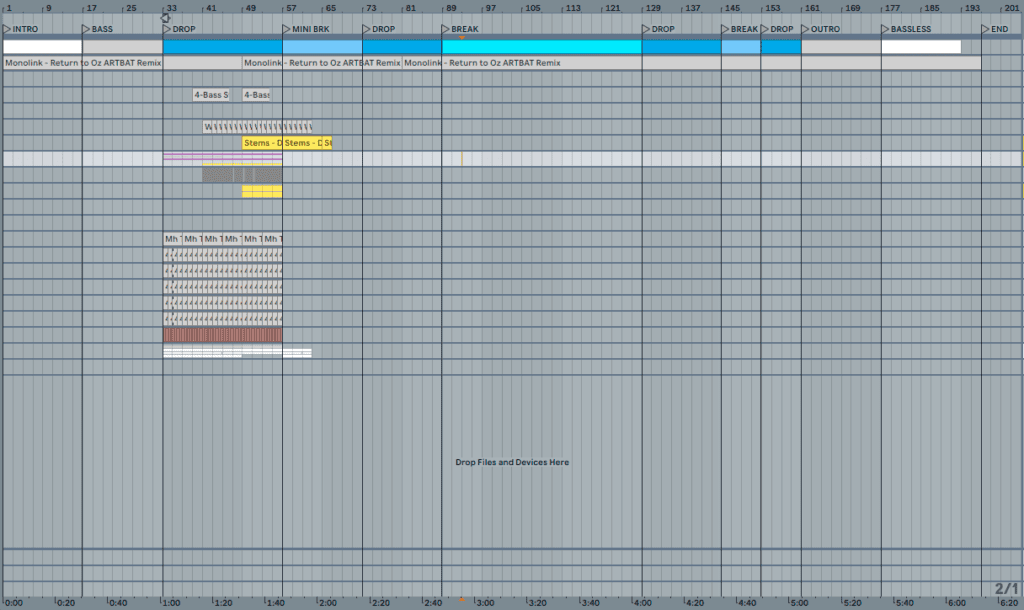 In musical terms, a vision could be an arrangement or a general feeling you want to convey. For example, when I start my tracks, I start with a section of the track and build it to make sure it works. If it does, then the next thing I do is envision the entire arrangement of the track, like the image below. You can check more about that in my post about enhancing your arrangements: