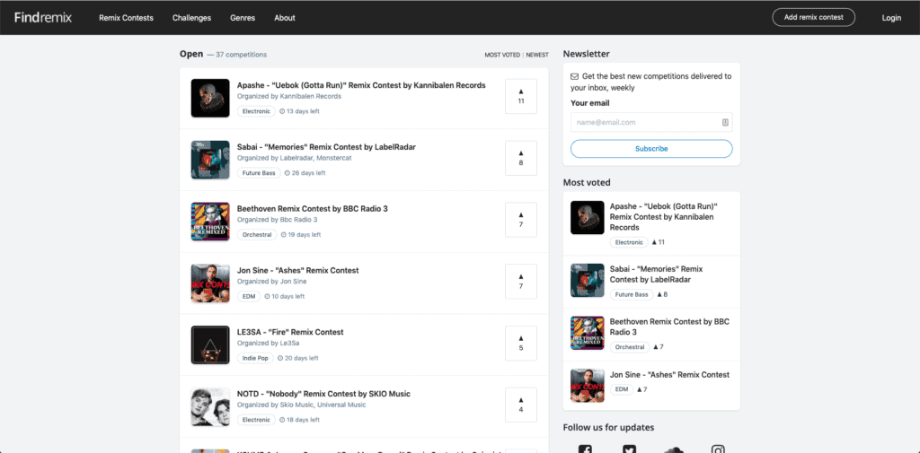 These competitions normally don’t have many “career restrictions”, and allow anyone to enter, which could be the best way for you to find a track for you to remix. The two most famous websites nowadays to find contests are MetaPop and Skio, which are platforms that host a few contests. However, if you go over to FindRemix, you can find A LOT more contests, including the ones on MetaPop and Skio.